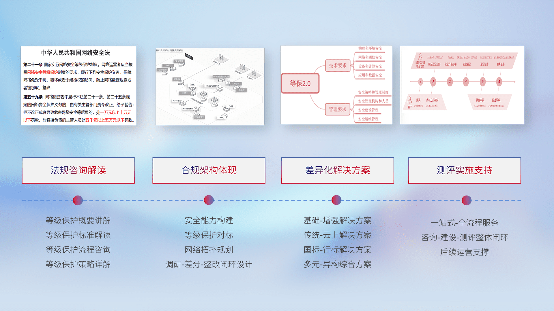 通过专业的法律咨询解读、、、、合规架构体现、、差异化解决方案、、、、测试实施支持等服务,,为客户量身打造等保合规体系。。